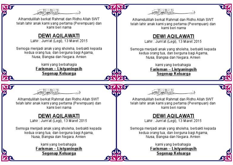 Ukuran Kartu Ucapan Aqiqah from cdn.kibrispdr.org Check spelling or type a new query. Maybe you would like to learn more about one of these? We did not find results for: Ucapan selapanan bayi di kotak nasi.